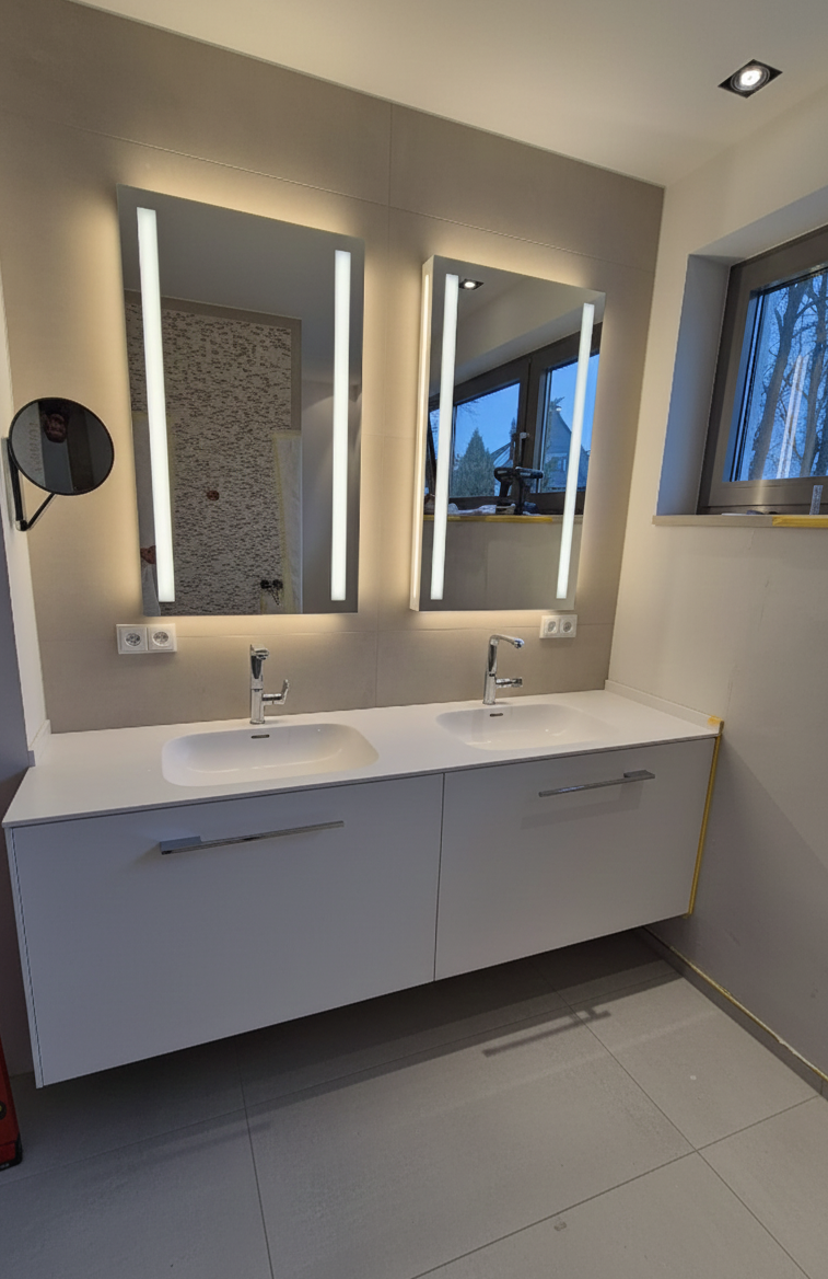 Hochschrank, zwei Schübe, großer Spiegel und LED,